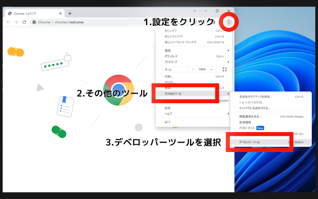 Google Chrome右上の「設定アイコン」をクリックします。「その他のツール」から「デベロッパーツール」を選択します。
